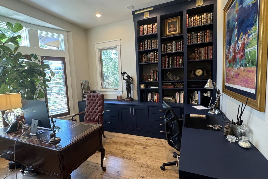 The rich Blu Fes finish beautifully compliments the natural wood flooring and antique desk, creating a cohesive and stylish home office. With plenty of storage and display space, this office is both practical and visually stunning—especially with her beautiful book collection on display.